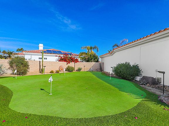 Outstanding south facing Home 3172 Sq. Ft., 4 spacious bedrooms, 4 ensuite baths, home office plus Powder Room on 14,810 Sq. Ft. lot with spectacular mountain views located on quiet cul-de-sac within Mountain Gate community at prestigious Indian Wells Country Club. Sparkling pebble tech Pool /Spa with cascading waterfall surrounded by fabulous professional low maintenance landscaping including large putting green. 2 New A/C'S installed October 6,2022 and leased Solar for lower home energy costs. Some furniture available outside of escrow. Front Entry awaits you with custom glass French doors. High ceilings throughout, plantation shutters and custom shades, neutral tiled floors, carpeted bedrooms, Living Room and spacious elegant Home Office. Living Room has clerestory windows and remote shades with beautiful pool and mountain views. The Family Room has tiled fireplace with mantel and built-in custom wood cabinets galore! Open Gourmet Kitchen with informal dining area, honey wood cabinets, beautiful granite countertops, big island and bar seating, stainless appliances including Sub-zero refrigerator, wine cooler, double oven, and large walk-in pantry. Primary Bedroom with sitting room and views; glass sliders out to Pool/Spa and large covered Patio. Primary Bath has two walk-in closets, dual Toto sinks, large shower in travertine stone and soak tub. Guest Bedrooms have walk-in closets and lots of storage cabinets in home. Low HOA dues $90 per month.