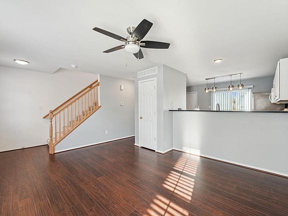 spacious living room opens to the Kitchen featuring white cabinets, center island with overhang for Eat-in dining, NEW quartz countertops, lighting and backsplash. Kitchen opens to a private patio and fenced area. Upstairs you will find 2 bedroom and 2 full bathrooms along with a 10x19 BONUS ROOM. The unfinished basement will give you an opportunity to add your own design the space. Seller is including the Refrigerator, washer and dryer in the sale. SCHEDULE YOUR APPOINTMENT NOW. Location: Corner Location, End Unit, Ground Level