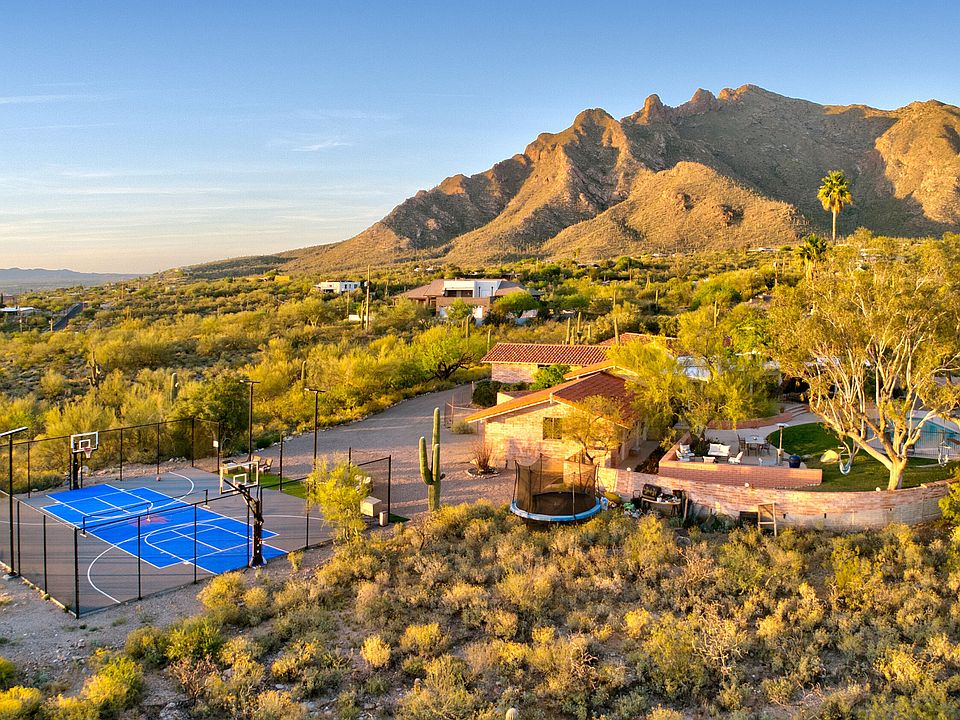 Outdoor living is equally impressive. Relax by the large pool/spa with its soothing waterfall, enjoy the scenic views from multiple outdoor living spaces, or freshen up in one of the two outdoor bathrooms or the outdoor shower. A recently built solar-lighted sports court offers a versatile space for tennis, pickleball, or basketball. Additional updates include new xeriscape landscaping, drip irrigation, a whole-house water filtration system, new carpet, and numerous electrical and plumbing enhancements.