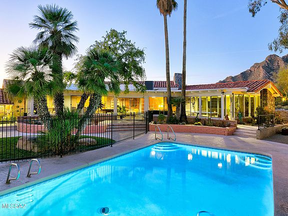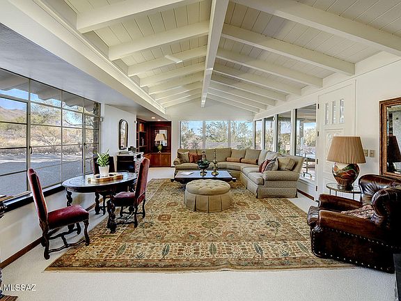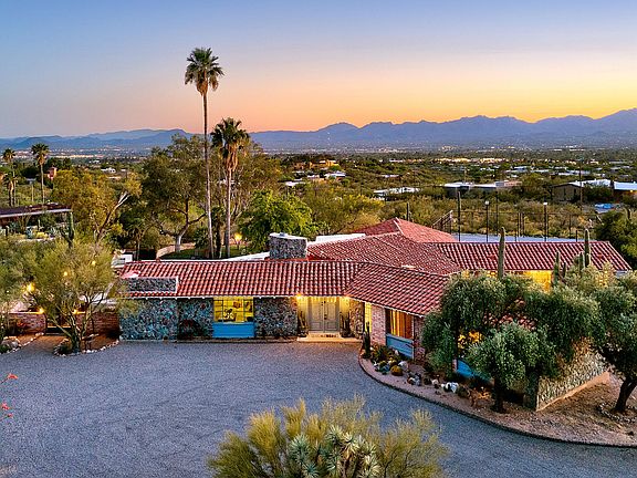 Nestled on 4.56 acres in Cobo Catalina Hills within the sought-after Catalina Foothills, this stunning ''classic Tucson'' home is truly one-of-a-kind. Rumored--though unconfirmed--to be designed by renowned Tucson architect Anne Rysdale, the 4,304 sq. ft. residence exudes meticulous craftsmanship and attention to detail.With 4 spacious bedrooms and 7 elegant baths, this architecturally significant home offers a perfect blend of rustic charm and modern convenience. Enjoy sweeping mountain and city views, including the dramatic Pusch Ridge, from walls of glass that frame the picturesque landscape. The home's unique character is highlighted by burnt adobe construction with chrysocolla stone accents, a brand-new mission tile roof with chinked mortar and underlayment, and soaring beamed ceilings.