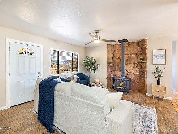 This single-story home is nestled on a sprawling 1-acre parcel of land and is a charming abode exuding simplicity and comfort. The interior of the home emanates warmth and coziness. The kitchen is thoughtfully designed with ample storage space. A highlight of the home is the expansive backyard, which serves as an outdoor oasis for both relaxation and recreation. The acre of land offers endless possibilities. Enjoy the magic of mountain living cozied up next to the wood burning stove in the living room. Its single-story design, thoughtfully appointed interior, and expansive outdoor space make it the perfect retreat for those seeking a peaceful escape in the embrace of nature.