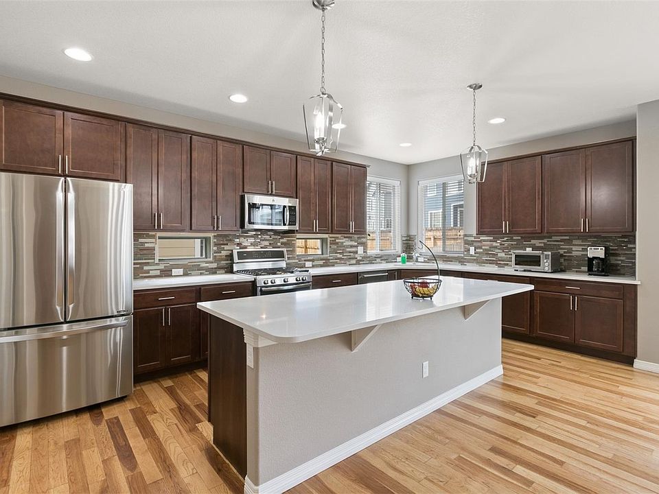 Welcome! This home has the "wow" factor the minute you walk through the front door. The main level has a custom tile entry, hickory hardwood flooring throughout, coffered living room ceiling and a kitchen you'll never want to leave with walk-in pantry, designer backsplash, quartz countertops, gas range and over-sized island. Upstairs has a conveniently located laundry, main bath and four bedrooms, all with walk-in closets. The large master suite has its own private sitting/office space, dual-sided gas fireplace, walk-in closet and private bath. The three car garage has 8' high doors with a side door allowing access to the fully fenced in backyard. A full, unfinished basement with egress windows and a rough-in bath can be finished out as you see fit. Make an offer today!