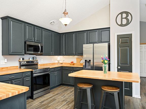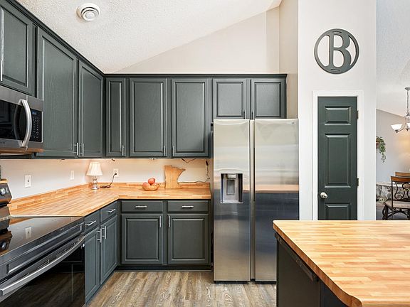 Welcome to this charming townhome offering convenient living all on one level w/ a private primary bathroom. 3 spacious BRs and 2 bathrooms, this home is thoughtfully designed to maximize comfort and functionality. The back of the home faces south, offering abundant natural light and scenic views of the adjacent neighborhood. Step into the huge kitchen with soaring vaulted ceilings, well painted cabinets w/ 42-inch uppers, new stainless steel appliances, pantry, & center island which is so desirable to have! Tasteful luxury vinyl plank flooring throughout main living areas, and cozy gas fireplace. Each BR is generously sized, with the primary bedroom boasting a large walk-in closet and private full primary bath with dual sinks, tile floors, & tile surround jetted tub. Two additional bedrooms, full bathroom, and laundry complete this townhome. 2 car attached garage. Conveniently located near 169 and Bass Lake Road and minutes to Target, restaurants, and other shopping.