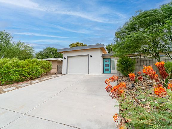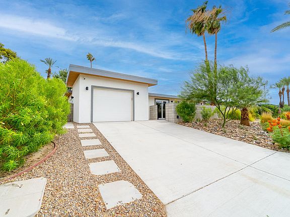 Welcome home to charming Indian Wells Village. Located a short distance to the Tennis Gardens and a just a few miles to the Coachella Music Festival fairgrounds, this beautiful three bedroom, two bath home built in 2018 has all of today's modern conveniences with the vibe and feel of a classic Mid-Century home. Walls of glass and stacking sliding doors that have automated blinds provide for a serene indoor/outdoor living experience where you can relax under a wonderful tongue and groove wood patio cover and are nestled around a pool with only nineteen neighbors. The master suite has a walk-in closet and large sliding glass doors that open to more outdoor views. Both guest bedrooms also have sliding glass doors that open to a warm, sunny, private patio with stunning southern mountain views. Not only are there designer finishes found throughout the home that include Nelson Buble Lamp Fixtures, Hansgrohe bathroom sinks and kitchen fixtures, Jonathan Adler drapery in the primary and guest bedrooms (fully automated in the primary), but there is also newly designed zero landscaping, Smart Home Automation and an owned 19 panel solar system with a Tesla Power wall. One of the only HOAs in Indian Wells that allows short term rentals, Indian Wells Village has a low monthly HOA fee of $350/month, which includes landscaping front/back + pool maintenance and pool. This is perfect for a weekend get-away, vacation home or investment property. Rental projections are at $85,000/year!!!!!!!!!
