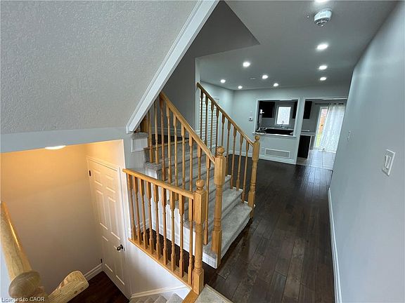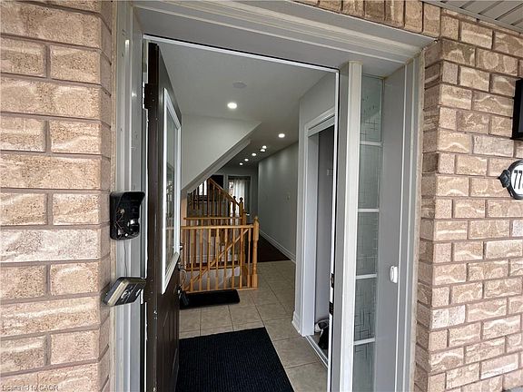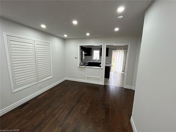 Double car garageSolid brick homeOpen conceptDark laminate flooringModern kitchenQuartz countertopsWalk-out to spacious backyard