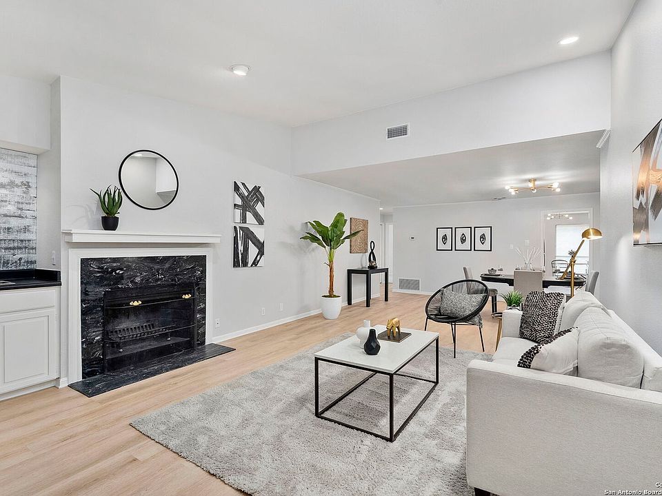 **Modern Condo Near Medical Center!** As a traveling medical professional or someone who values a solid investment over renting, this beautifully updated modern condo in the desirable Tower Point gated community is the perfect choice for you. !!!Interior just recently updated!!! The bright and spacious floor plan features a living area with a wet bar, fireplace, and lofty ceiling, ideal for both entertaining and relaxing. Recessed lighting in living room, and kitchen area. The charming galley kitchen boasts white cabinetry, stunning quartz countertops, a white subway tile backsplash, and elegant bronze hardware and fixtures. Additionally, the kitchen includes stainless steel appliances and a cozy breakfast nook. The primary bedroom offers a spa-like en-suite bathroom with dual vanities, a soaking tub, and a rainfall showerhead, ensuring ultimate comfort. Step outside to enjoy the fresh air on your private balcony. This condo's highly sought-after location is perfect for medical professionals, or anyone alike, with proximity to the medical center, just 10 minutes from the airport, and minutes from USAA, UTSA, and exceptional shopping and dining. Make this your new home and experience modern living in a prime setting. Don't miss this opportunity - it's sure to go quickly!