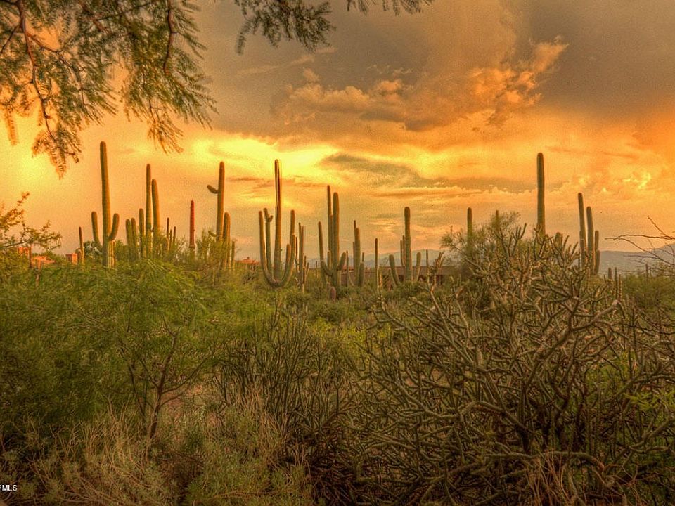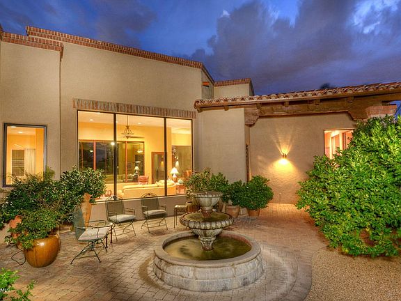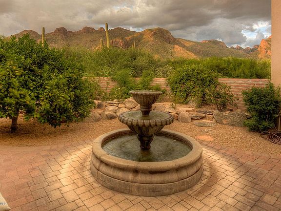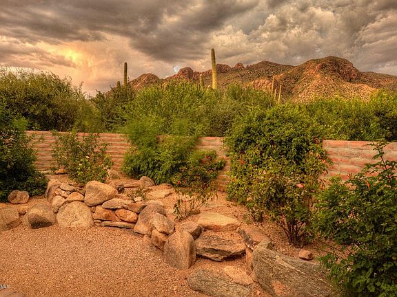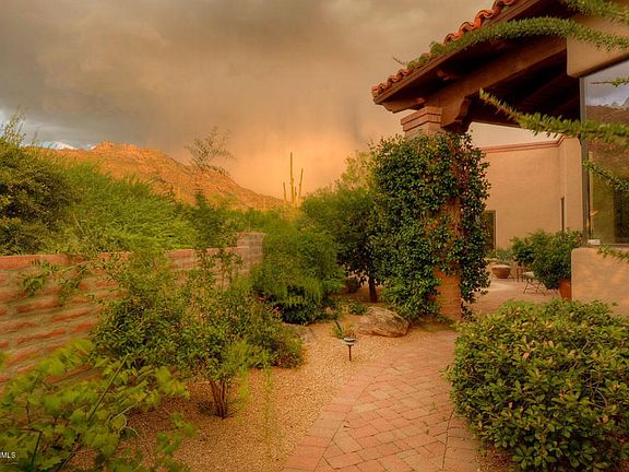 Private sanctuary sited amongst towering saguaros, pristine desert, lush gardens of inviting courtyard entry. Fountain, custom iron entry door and extraordinary bkyd gardens, covered patios and fireplace, Pebble Tek pool/spa, BBQ+ 672 SF Guest House. A classic territorial pristine in design+detail. Over sized windows frame see thru mountain and city views, courtyard and rear patio outdoor areas. Great room design features blt-in media center w/closable carved wooden doors, surround sound+orange travertine FP. Gourmet kitchen with granite island, SS appls incl Thermador prof commercial stove, prep sink. Lovely Master Suite. Over sized bathroom has marble counters/surrounds, tub overlooks rose garden fountain, enormous master closet. Split plan flex, 2 Bedrooms w/3/4 baths. Spectacular GH.