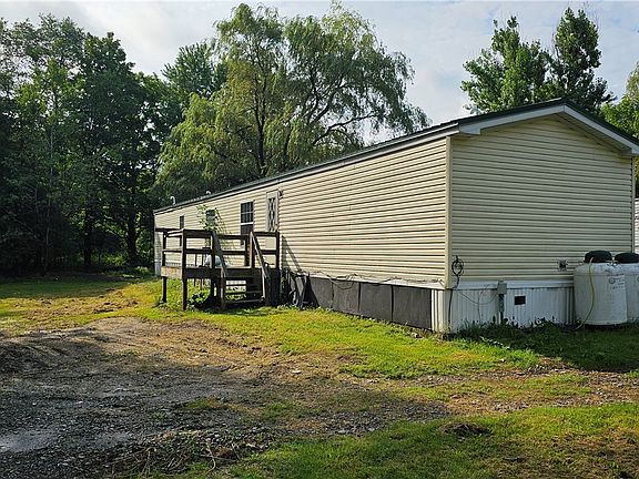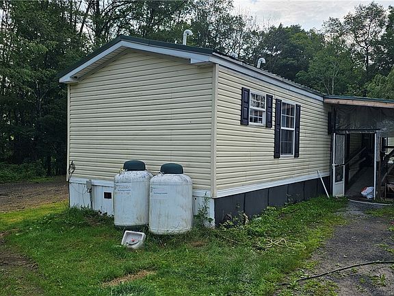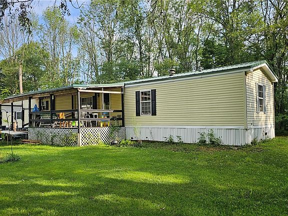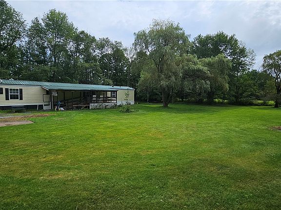 Discover your private retreat on 3 acres with a single-wide home on a slab foundation, featuring 3 bedrooms, 2 baths, and a covered porch. Enjoy the spacious 3-car garage and the beautifully treed, flat yard, ideal for relaxation and outdoor activities. This peaceful property offers the perfect blend of privacy and space. Directly across the road is access to the Finger Lakes Hiking Trail and less than a mile to 1300 acres of state land. (Wiley Brook State Forest) Don’t miss this unique opportunity.