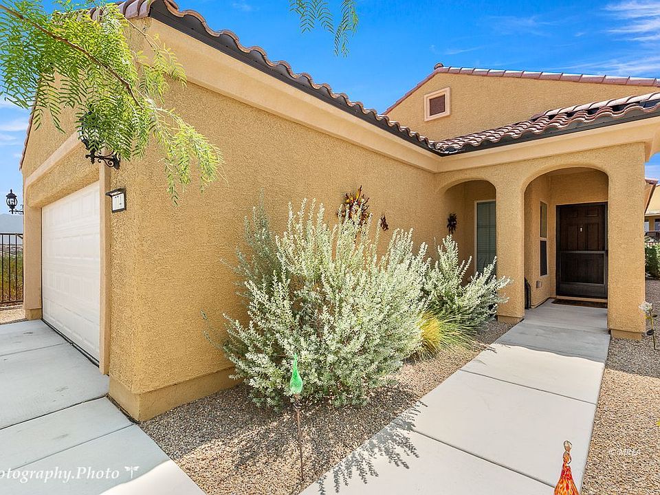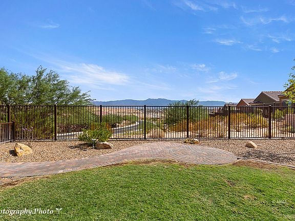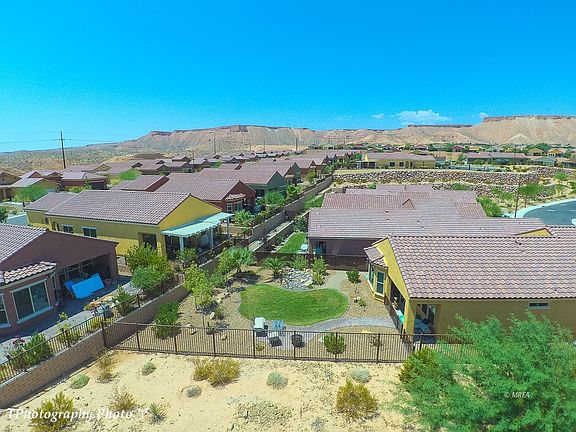 BEST VALUE ON A VIEW LOT! PRICED ADJUSTED TO SELL! Highly sought after elevated mountain view homesite with lovely Sun City Mesquite Aster home. Fully fenced so your furry friends can enjoy the grassy yard or the large covered patio.Enjoy sun & moon rises from the pavered seating area. The professional landscaping on this costly pool-sized, fully fenced lot is stunning. There is a custom-designed desert rock water feature. Its prime location at the end of a cul-de-sac provides plenty of mountain views to the North and East. Plenty of room for entertaining. The extra long driveway at the front of the home is a bonus! This 1449 sf, 2BR, 2BA, + den with French doors, home has many costly upgrades. The large dine-in kitchen has a bay window & custom island. The backsplash is beautiful and compliments the upgraded granite countertops. All kitchen appliances, including the refrigerator, stay! The primary bathroom has been upgraded to include solid surface countertops and a custom tiled shower. Don't wait 11 months for a new home when you can make this beauty yours!! Move in ready so you can start enjoying all of the Sun City Mesquite amenities before the holidays! More photos by 11/3/21