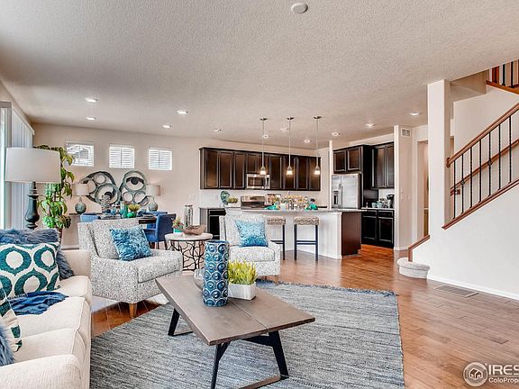 Welcome to your new home in beautiful Flatiron Meadows! Many extras including hardwood flooring & 9ft. ceilings on main floor, rounded drywall corners & brushed nickel fixtures. Vaulted foyer makes a classic entrance. Main floor study. You'll love hosting in your formal dining room. Entertainer's dream eat-in kitchen w/oversized island opens to family room & features Azul Platino granite countertops, stainless appliances & Espresso 42" maple cabinets w/crown molding.