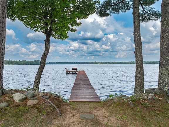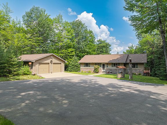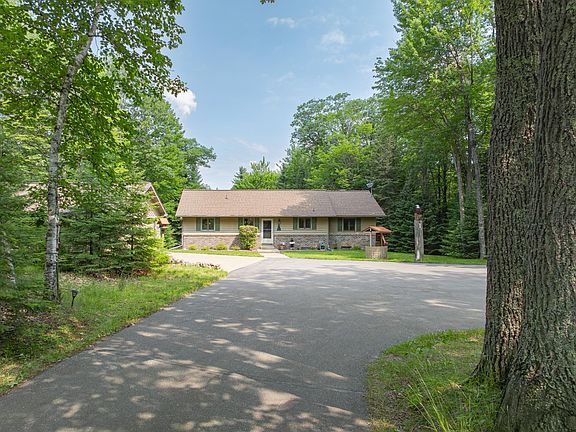 This exceptionally well-maintained home on Big Stone, Three Lakes Chain has much to brag about! The location on the water has fantastic level sandy shoreline and expansive views from the pier- grab a drink and watch the ski show from your dock. This ranch home has a walkout lower level, cedar and brick sided exterior with 2704 sq. ft on both levels. Attractively designed with an open concept interior with knotty pine vaulted ceiling in the living room & a corner gas fireplace. The wraparound lakeside deck is accessible by sliding doors. Lower level is fully finished & walks out a few steps to lovely front yard. There are numerous updates listed in the Feature Sheet in documents, including a new roof on home & garage, paved driveway, updated oak cabinetry, and a split AC unit in living room The detached 2+ car garage & lakeside shed offer quality storage space. This location is ideal for the snowmobile/ATV route access, walking distance to the golf course and boating the 28 lake Chain.