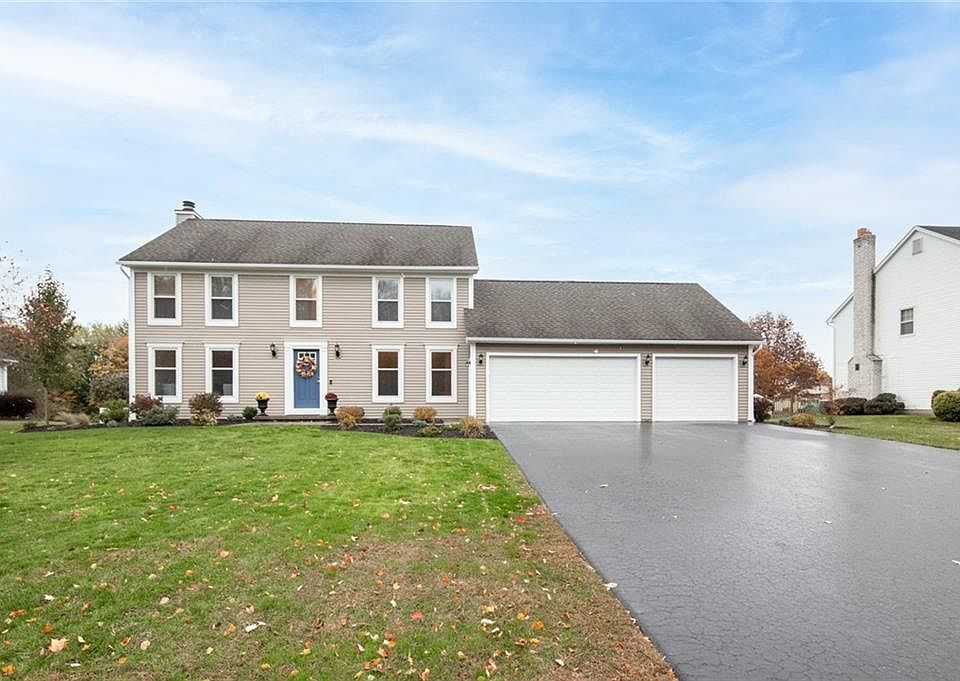 So many possibilities w/ this completely renovated, upgraded & rarely available Schantz built colonial in Webster! Nearly 2800 square feet between the main house and the true in-law section. The main house features a 3 car garage, 3 spacious bedrooms, 2.5 updated baths, open floor plan, front to back great room, large kitchen w/granite counters, breakfast bar, & newer stainless appliances opens to formal dining, 1st-floor laundry, full-length master wing w/ double closets, one of 3 gas fireplaces, stone tiled shower, double vanity, new wall to wall carpet, hardwood floors, partially finished basement & more. True in-law, guest suite or home office boasts living/dining room w/ gas fireplace, bedroom, walk-in closet, full bath with some accessibility features, galley kitchen, private entrance, & separate mechanics. Both the home and in-law suite lead to the huge (16x35) new stamped concrete patio. Whole house generator included. Newer roof, freshly painted, new doors/slider, new lighting fixtures, new landscaping, & new laminate flooring in great room. Basement plumbed for future bath. 1st showings Sat. November 7th & delayed negotiation Monday November 9th. Offers due at 5pm