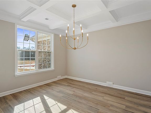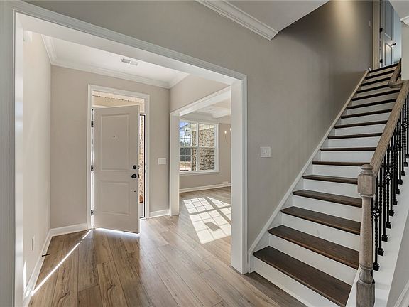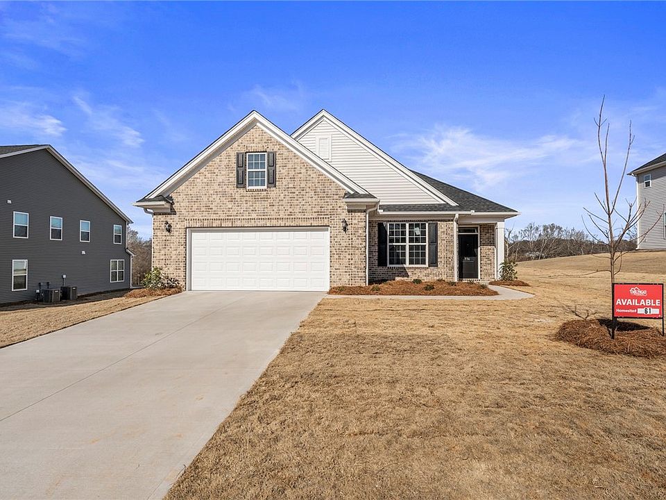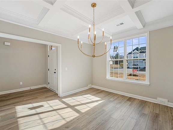 This Chadwick is a one-and-one-half story home that features three bedrooms and two bathrooms on the main level and a large extra room, half bath, and closet upstairs. The home has an open concept with a large great room with a gas fireplace and tray ceilings, a formal dining room with coffered ceilings, and a kitchen that has gourmet style appliances, a smooth cooktop with stainless steel range hood, quartz countertops, and tile backsplash. The primary suite has a tray ceiling, a large tile surround shower, and a large walk-in closet. Off the back of the home, there is a covered porch and a large patio that overlooks a wooded, private backyard.