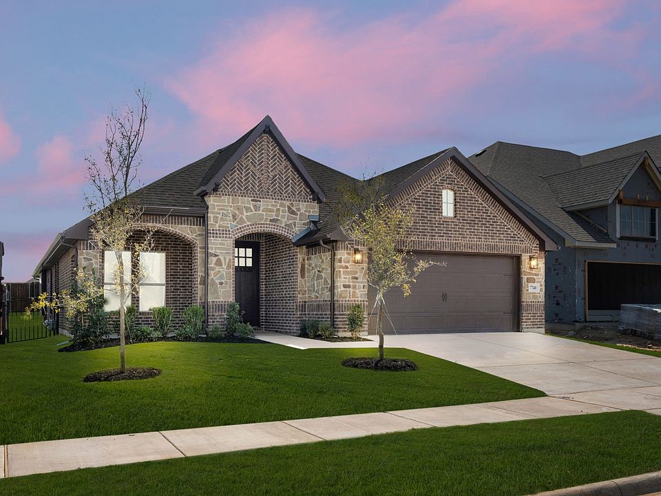 MLS# 21079129 - Built by Landsea Homes - Ready Now! ~ This thoughtfully designed, single-story home balances comfort, style, and function. At the heart of the layout is an open-concept kitchen with a large island that overlooks both the dining area and the family room—ideal for everyday living and entertaining alike. A cozy electric fireplace brings warmth and charm to the space. The primary suite is privately located in the back corner and features a spacious walk-in closet and a luxurious bath with dual sinks, a soaking tub, and a separate shower. Two additional bedrooms are positioned near a full bath, perfect for family or guests. A dedicated study at the front of the home offers a quiet retreat for work or hobbies, while the utility room and ample storage throughout the home keep things organized. Step outside to enjoy the covered patio—perfect for relaxing evenings or weekend barbecues.