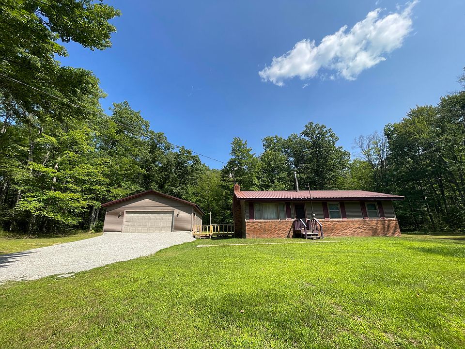 Charming 2-bedroom, 1-bathroom ranch-style home nestled on 20 peaceful acres adjacent to Huron National Forest. The property includes a 2.5-car garage and a spacious laundry room, both offering ample storage. The home also features a durable metal roof and has recently updated the bathroom with a brand new tub/shower and toilet. While cable internet isn't available, HughesNet or Starlink are great options for staying connected. The home is equipped with a propane furnace, updated 7 years ago, though the current owner prefers the cozy warmth of the wood stove. Whether you're seeking a tranquil private retreat, a hunting camp, or a year-round residence, this property offers endless possibilities in a prime location.