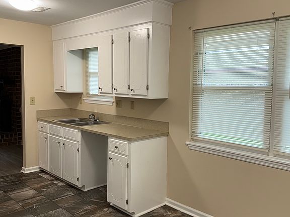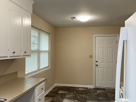 Kitchen features white appliances with white cabinets. Great laminate tile floors that looks like tile