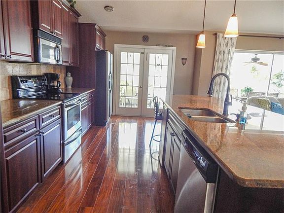 ROSEWOOD at River Ridge offers this remodeled 3 bedroom POOL home with loads of high end upgrades. Wow - the kitchen is stunning with cherry wood cabinetry, a huge island with built in wine fridge, all topped off with beautiful granite! Stainless steel appliances and high quality wood laminate floors complete the look. With an open floor plan and vaulted ceilings, the Living Room and Formal Dining Room all flow together for a spacious, yet cozy feel. The Master Bedroom is huge, with a sitting/office area at one end. The Master Bath is remodeled with a jacuzzi garden tub, separate shower and a granite topped vanity with two sinks. Bedrooms 2 & 3 are across the other side of the house, both are a good size and share another updated bathroom with a tub/shower. Sit outside in the screened Florida Room to eat, or relax by the Pool which has jetted seating and a 4ft depth throughout for playing water volleyball. The backyard is fully fenced. Inside laundry room and 2 car garage. Home was repaired for sinkhole damage in 2011 and has all the necessary documentation for insurance purposes, plus a lifetime transferable warranty. Definitely worth a look!!