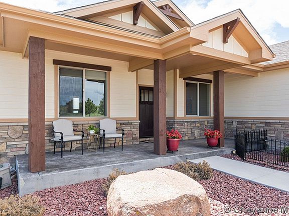 This elegant Woods Brothers executive home sits on 4.5 acres located in coveted Fox Run with thoughtful landscaping including nearly 70 mature trees on a drip system. Better than new and absolutely turn key! All the characteristics of a custom build. High end finishes throughout with pecan cabinetry, natural hickory floors, superior granite counter tops, knotty alder trim and doors, and new carpet throughout. Kitchen offers newer appliances, a grand copper wrapped range hood and pot filler. Southwest facing walk out basement with breath taking views of the mountains. Double sided fireplace between living room and spacious covered deck, perfect for summer time gatherings or a quiet cup of coffee! If you prefer a sunrise view there’s a covered patio for that too! Split floor plan with three generously sized bedrooms. Master bedroom is a perfect retreat with large exterior door leading to the back deck for more opportunity to enjoy the fabulous view. Master bath is a dream with his and her vanities, gorgeous decorative tile and heated flooring. In the basement you will be pleasantly surprised by the vaulted gun room exquisitely crafted with buggy pine. The remainder of the basement is framed and ready for someone to make their own. Close to town, all paved roads and paved driveway from street to door! Oh.. and don’t forget the 4 car garage, RV parking, tankless water heater, as well as the interior and exterior surround sound system. Too many fabulous things to mention! This home is an absolute gem!!