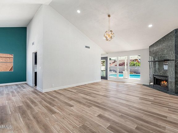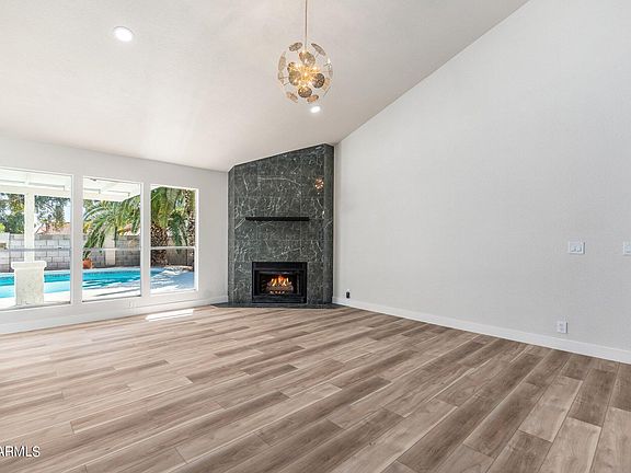 A stunning single-family home located in the highly sought-after city of Peoria. This beautiful 4-bed, 2-bath, 2 car-garage home is situated on a spacious lot and almost 1,800 square feet of living space. As you step inside, you'll be greeted by a bright and airy floor plan that's perfect for entertaining. The spacious living room features soaring ceilings, large windows that let in plenty of natural light, and a cozy fireplace that's perfect for chilly nights. The adjacent dining area is perfect for hosting family dinners or intimate gatherings with friends. The kitchen comes with stainless steel appliances, quartz countertops and brand-new black shaker cabinets. Brand new vinyl wood and carpet flooring throughout the home. Enjoy the fully upgraded, spa like bathrooms with high end shower niche, and custom vanities. Large pool that's fully re-plastered, covered patio with tons of shade perfect for outdoor living and entertaining. Don't miss your chance to make this incredible home your own - schedule your showing today!