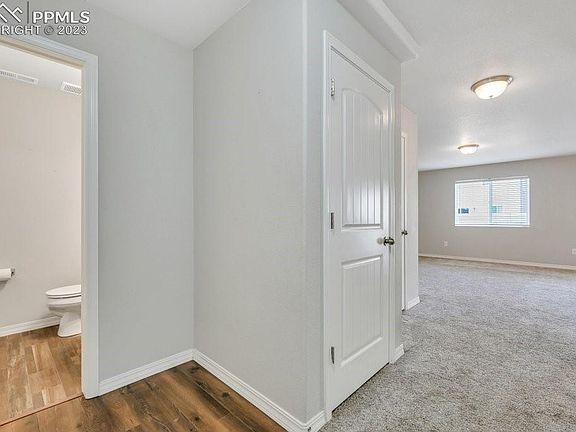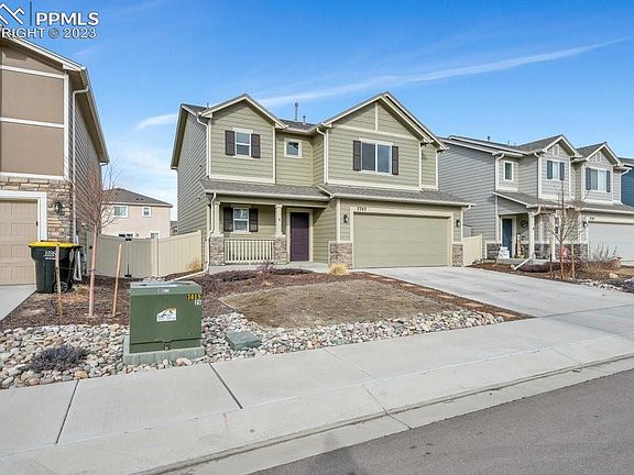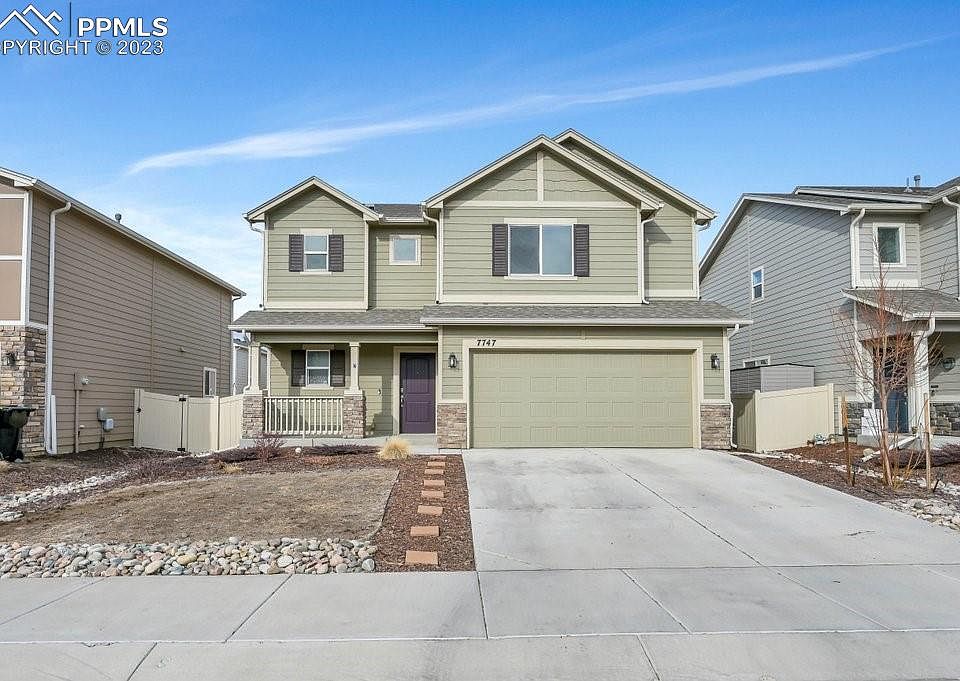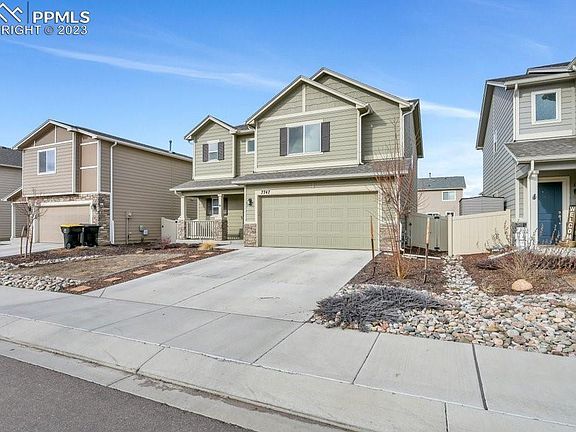 This home is a must see, built new in 2019 and just 15 minutes to Fort Carson! The exterior offers beautiful curb appeal, stone accents, and a front porch perfect for morning coffee. Upon entry, you walk into an open concept living space and a large kitchen with stainless steel appliances, granite counter tops, and a walk in pantry. Following the sliding glass doors to the fully fenced back yard, you will find the yard backs up to walking trails that take you to the park or the community center that hosts a pool, hot tub and gym. Upstairs you will find a large laundry room conveniently located next to the bedrooms. When opening the beautiful French doors, you are welcomed into the oversized primary suite with a soaking tub, double vanity, and a walk in closet. Accompanying the other 2 bedrooms is a jack and jill bathroom. This home has a sprinkler system to keep both the front and back yard low maintenance! The ADT security system is fully paid off.