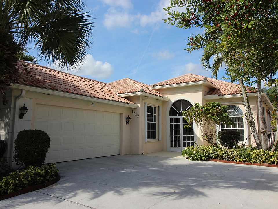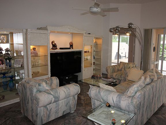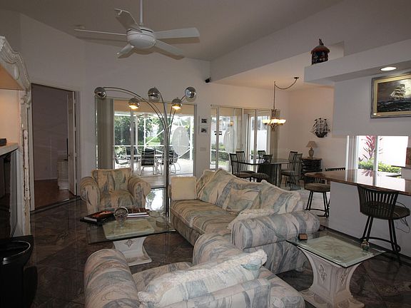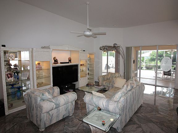 Outstanding value for this pristine ''Oakmont'' model. The house features a magnificent screened patio which is partially covered, perfect for outdoor entertaining! The patio is completely tiled and has some built in cabinetry and a custom tiled mural. The Great room has 12ft ceilings, double sliders that pocket back leading to the patio, stunning custom marble flooring in the living room and laminate flooring in the den and master bedroom. Granite kitchen counters, accordion shutters, and many other decorative touches! The master bathroom has a unique double set up, one side has a vanity and shower and the other a vanity and roman tub! The side yard has been beautified with marble touches and an awning over the side patio, the perfect spot for a barbeque! Another attractive featu