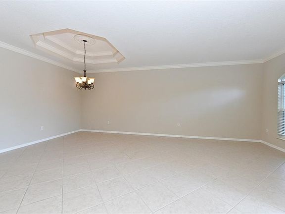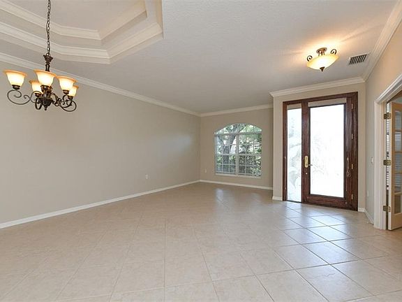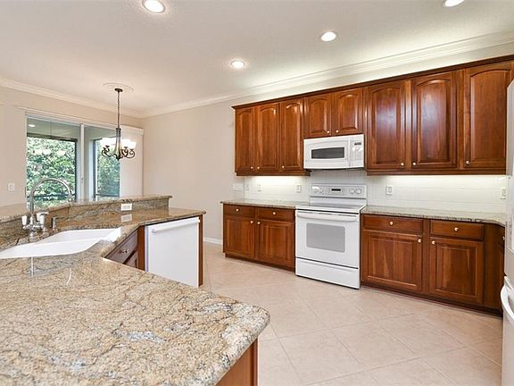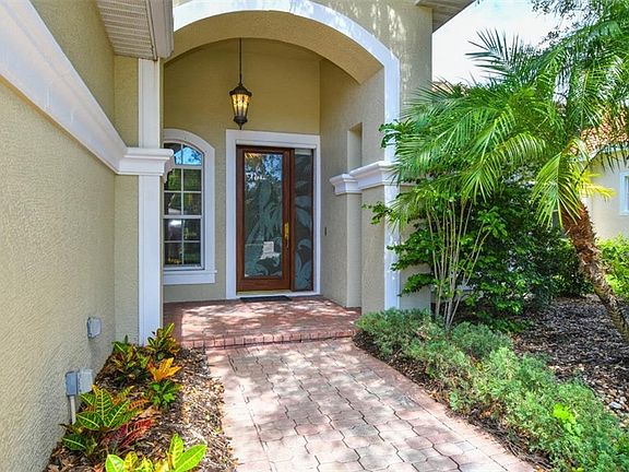 Lush landscaping & an attractive elevation create a lasting impression as you approach this immaculate & well-designed home w/coveted 3-car garage. From the moment you step in through the custom lead glass mahogany-carved front door, you will notice architectural details & upgrades including tile floors on the diagonal throughout, coffered ceilings in MBR & DR, crown moldings, new interior painting, & suited closets in all bedrooms. Preparing your favorite meals is a delight in the well-appointed kitchen featuring rich cherry wood cabinets w/stainless steel sliding draws, tile backsplash, granite counters, breakfast bar, pantry, water filtration system, lighting under & above cabinets, & adjacent dinette w/sliders to lanai. Kitchen is open to Family Room for seamless entertaining. Living room/dining room combination invites cheerful gatherings while double french doors lead to office where you will find the perfect space to relax & read your favorite book. Generously sized master suite features sliders to lanai, huge suited walk-in closet, & elegant bath for pampering. All guest baths offer wood cabinetry. 3M film on all windows & doors as well as hurricane Lexan shutters all around including lanai. Other notable features are decorative polyaspartic floor coating in garage, ceiling fan & LED light fixtures in garage, electric & gas connections for range & dryer, exquisite light fixtures & window treatments, laundry room cabinets, gutters front & back of home, rolling shades on lanai, & much more!