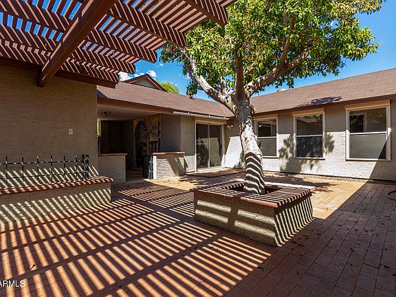 You'll LOVE this fantastic home in a great Peoria location! Providing 3 beds, 2 baths, RV gate, & a detached 2-car garage. The charm starts with the atrium area w/built-in seat & private courtyard set on pavers. Discover a formal dining room and a large living room w/stone wall fireplace! Vaulted ceilings add to the airy feel, complemented by tons of natural light. The kitchen includes built-in appliances, ample counter space, and white shaker cabinetry. All bedrooms boasts plush carpet! Main bedroom has sliding doors to the courtyard and an ensuite with dual sinks & a walk-in closet. The large backyard is beautifully divided! One side offers a tranquil retreat with a covered patio & mature tree, while the other features a pergola, fireplace, custom bar counter, & a fenced pool. Just WOW!