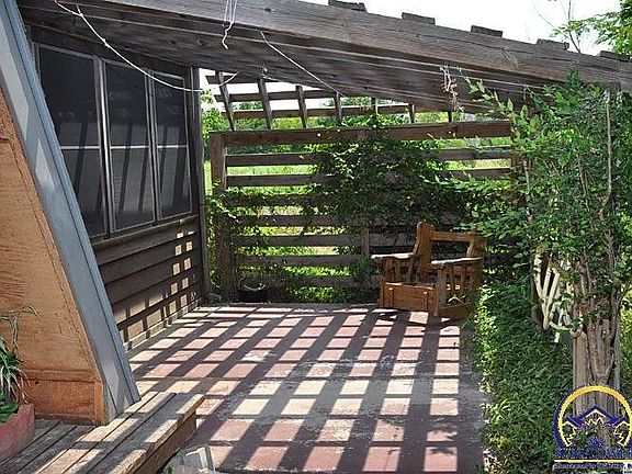 Beautiful rustic retreat!! Pond in the front of the house for a beautiful view. 3 bedroom 1 bath, A-Frame on 5 m/l acres. Fenced for livestock or horses. Comes with 2 carports. On paved road near US 75 Hwy for easy access to Topeka. Beautiful solid fiberglass door that looks like solid wood.
