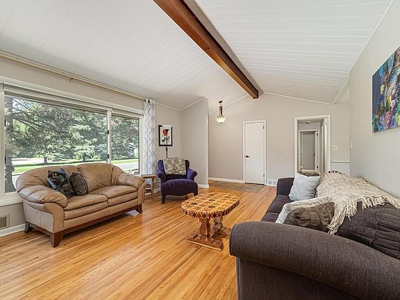 Golden Valley mid century situated perfectly on a mature lot in ideal location! Main level features three beds, full bath with dual sinks, updates living spaces with lovely touches throughout. Wood beam highlights the painted wood vaulted ceiling, gas fireplace with stone surround accented by the painted wall of wood, gorgeous hardwood floors, updated Andersen windows, stainless steel appliances and sparling countertops and more! Fully finished lower level with fourth bed, additional flex space and spacious family room! Large low maintenance deck overlooks the fully fenced rear yard that includes a convenient storage shed.