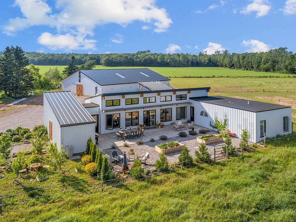 This stunning four-year-old custom-designed open concept home is located on a 7.5-acre hobby farm, just eight minutes from Cornwall and 15 minutes from Charlottetown. The property offers stunning views of the south shore and boasts architectural details that create a welcoming atmosphere. As you step inside, you'll notice the large custom-built beams that draw your eyes up to the custom ceiling and out to the expansive courtyard, offering beautiful views. The European-style design of the home not only adds charm but also ensures high energy efficiency. This property is conveniently located close to various amenities, including a grocery store, bakery, pharmacy, hair salon, and physiotherapy clinic. If you need access to additional services and amenities, Charlottetown is only a 15-minute drive away. The area surrounding the property offers plenty of recreational opportunities. You'll find the Bluefield family of schools nearby, as well as Argyle Shore Provincial Park, which provides easy access to the water and wildlife. For outdoor enthusiasts, there's Skmaqn-Port-la-Joye-Fort Amherst National Historic site, Bonshaw Provincial Park, where you can explore nature and enjoy activities like hiking and climbing. If you're a golf enthusiast, there are three golf courses in the vicinity. Additionally, the Matos winery and distillery offer a nearby option for wine tasting and relaxation. The property features a 60 x 80 livestock arena with access to the pasture fields.The home itself features two bedrooms and two bathrooms, along with a spacious storage area that could easily be converted into a third bedroom if desired. With its custom design, energy efficiency, and convenient location, this property offers a comfortable and enjoyable living experience.