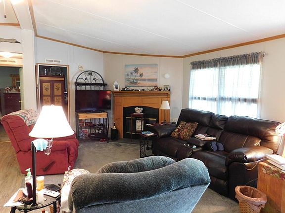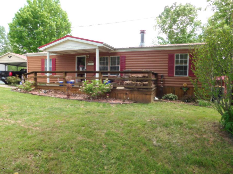 This lakefront home has a gentle slope to the lake, a dock on the water and lots of space to enjoy the outdoors. It is a 3 BR, 2 BA mobile home, approximately 1152 sq ft, with a sunroom and covered porches on the front and back. The property has beautiful views of the lake and a spacious lawn. There is plenty of space for parking, 2 mobile carports and 4 sheds connected for lots of storage space.
