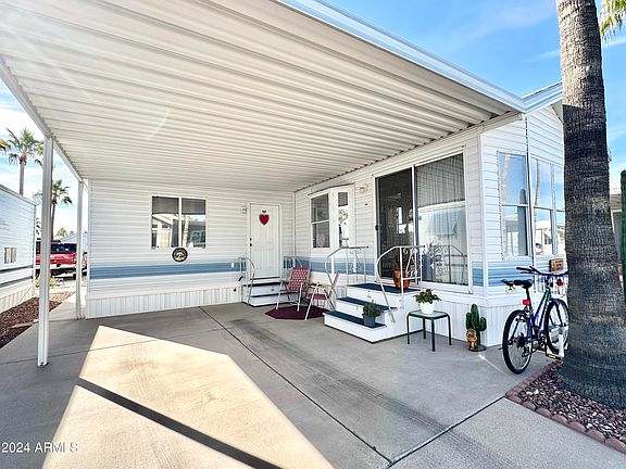 HERE'S YOUR OPPORTUNITY to OWN this CHARMING HOME! LOCATED IN THE SOUGHT AFTER GOLDEN VISTA 55+ RESORT! Where you OWN THE LAND! This WARM WINTER retreat is waiting for you! NICELY SITUATED NORTH FACING W/ CAPTIVATING MOUNTAIN VIEWS! 1 bed, 1 bath w/ LOVELY AZ ROOM. Your friends & family will LOVE coming to visit having their OWN SPACE! FURNISHED including a SOFA SLEEPER, all the necessities so all you have to do is pack up your bags & COME ENJOY! NICE SIZABLE half bath off AZ room with a FULL SIZE WASHER/DRYER for your convenience. DELIGHTFUL COZY BEDROOM w/ QUEEN SIZE BED & TWO BUILT IN DRESSERS along with cabinets above gives SO MUCH STORAGE ROOM W/ AN ADDITONAL LARGE MIRRORED CLOSET. You won't run out of space! FABULOUS U-SHAPED kitchen awaits you perfect for all your cooking needs. FULL SIZE STOVE, MIRCROWAVE & GREAT COUNTER space w/ dining nook adjacent. Main bathroom has a TUB/SHOWER COMBO. INVITING front living space is comfy & perfect for relaxing! You will LOVE your MOUNTAIN PEAK VIEWS from inside! Neutral colors throughout, CABINETRY GALORE & WELL LOVED! STEP out to your back LARGE PATIO to take in the SUNSHINE, RELAX or BBQ up your favorites. FANTASTIC BUILT ON SHED allows for a great additional storage space for your tools, golf clubs & extras! COME spend sometime exploring BEAUTIFUL ARIZONA! GOLF, HIKE, BIKE.....TAKE part in all the activities this FABULOUS RESORT HAS TO OFFER. This little slice of heaven is waiting for you!