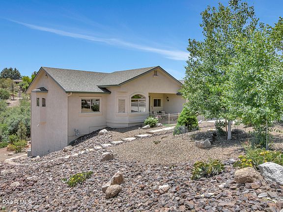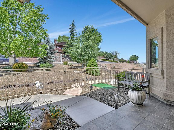 Situated in the desirable Yavapai Hills community, this beautiful home boasts an amazing setting with privacy, views and backs up to a greenbelt! This home has stunning architectural design with big windows throughout! The interior features an open & spacious great room concept, split bedroom floor plan, tile & wood flooring throughout, two fireplaces & wet bar with 2 bar fridges. The kitchen is well appointed w/ views out the kitchen sink window, abundant antique finished cabinetry & stainless steel appliances. The kitchen also features a generously sized island perfect for entertaining or casual dining, a spacious dining nook with turret & wrap-around windows looking over the backyard views.
