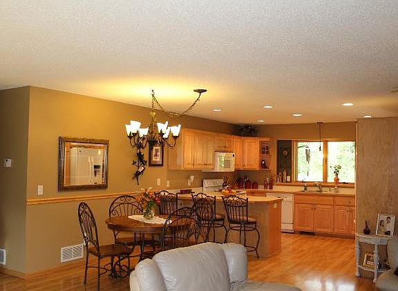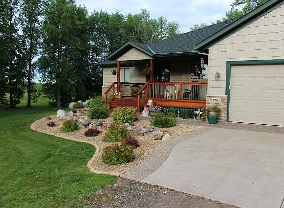 Loaded, meticulous 1 level home on 5 acres. Great care and planning by owner/builder. Kitchen boasts Maple Cabinets w/pantry & breakfast bar. Down stairs wet bar w/knotty pine, glass front cabinets w/wine cellar & dishwasher. Lrg heated garage, flr drain, Directions: 169 North, Right on 55th (Co Rd 13), turn left on 85th Ave., turn right on 60th, turn left on 70th Ave., turn right on 75th & left on 65th to home.