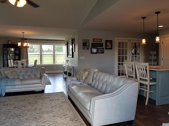 Newly built in 2015, beautiful ranch home, 3 bedroom 2 bath, custom built by Capstone. Everything is practically brand new including the stainless steel appliances that were purchased with 5 year warranties in 2015. Open floor plan with cathedral ceilings in the living room, opening to the kitchen and dining room. Right off of the kitchen, enter the office/study with glass french doors. This room has a prairie style window overlooking the farmland view. The dining room is also flooded with natural light that carries into the rest of the open floor plan with the prairie style windows displaying the view. Quality Riceland Cabinets beautiful white cabinetry throughout the home with slow close hinges and oil rubbed bronze hardware that match. A nice full size 12 coarse insulated basement is ready to be finished, already rough plumbed for a full bathroom. Wicker Creek is a beautiful quiet country setting neighborhood that is a 2 street cul de sac neighborhood tucked away, but close and quick access to the highway and Washington Square and many other amenities. Truly a MUST SEE!