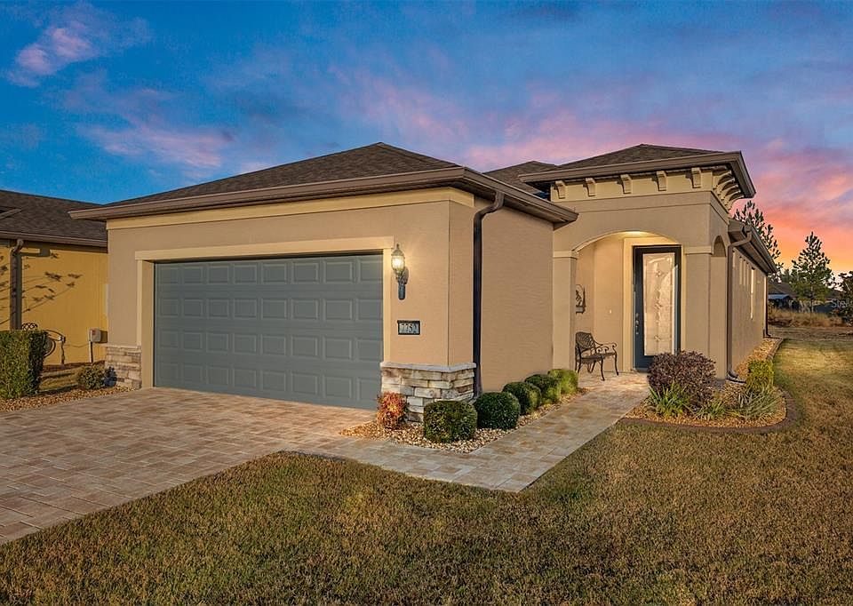 Welcome to this beautifully maintained TURN-KEYCrestview model home in the highly sought-after Del Webb Stone Creek community. This three-bedroom, two-bathroom residence with a spacious flex room provides an ideal blend of comfort, style, and functionality. Best of all, it is FULLY FURNISHED and includes everything you need—bring your toothbrush and golf clubs The home has an extensive list of upgrades, including a Paved Driveway and Entrance, Plantation Shutters, Tile throughout the entire house, a painted exterior in December 2023, Custom Curbing, and River Rock to give it beautiful curb appeal. As you step through the front door, you'll be greeted by an open and inviting floor plan featuring high ceilings and abundant natural light. The well-appointed kitchen boasts modern appliances, ample cabinetry, and a large island perfect for preparing meals or gathering with friends and family. The adjacent living and dining areas create a seamless flow, ideal for everyday living and entertaining. The primary suite is a peaceful retreat featuring a generous walk-in closet and an en-suite bathroom with dual sinks, a walk-in shower, and plenty of storage. The guest bedroom is equally inviting, with easy access to the second bathroom. Step outside into the screened-in lanai, where you can enjoy the beautiful Florida weather in privacy. Whether sipping your morning coffee or relaxing in the evening, this space offers the perfect spot to unwind. This home is located in Del Webb Stone Creek, a vibrant 55+ active community with incredible amenities such as golf, a clubhouse, a fitness center, a resort-style pool, and various clubs and activities to enhance your lifestyle. Don’t miss out on the opportunity to own this stunning Crestview model home. Schedule your private tour today!