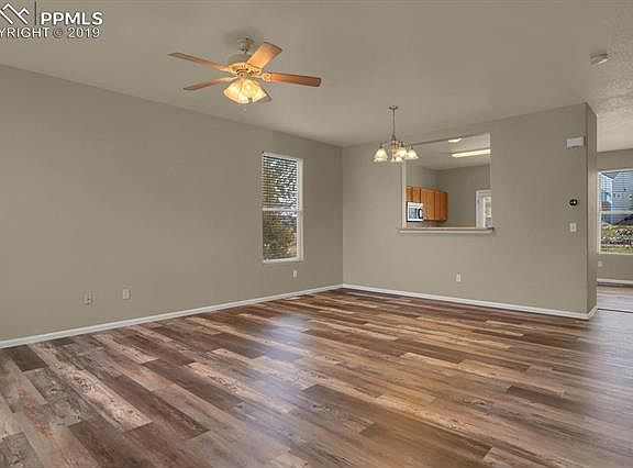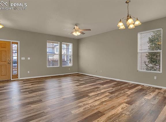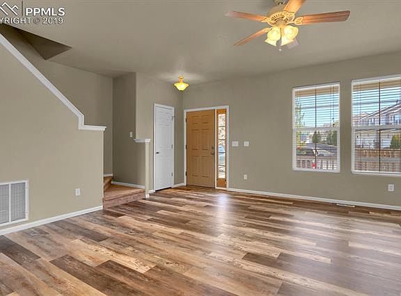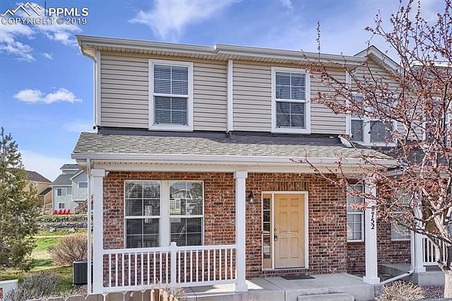 Spacious end unit townhome located just minutes away from Fort Carson, Powers Blvd, I-25, and Peterson AFB. Open floorpan allows for entertaining and dining on the main floor with upstairs bedroom comfort. The home backs up to green space and trails lending to outdoor activities and breath taking views from the convenience of your walkout kitchen. Newly repainted interior and installed luxury vinyl plank throughout the main floor lend to an updated feel. Stainless steel appliances and in-unit laundry add to the amenities. Enjoy the ease of the pass through kitchen into the dining area while serving meals. The addition of a main floor powder room complement the utilitarian concept of this home. Outback is an HOA maintained yard space perfect for entertaining guests and grilling up food in the beautiful outdoor ambiance. Upstairs you will find two good sized bedrooms with a servicing full bathroom located in the sizable hallway layout. The roomy master bedroom has vaulted ceilings with ceiling fan and a large walk-in closet in addition to an attached ensuite bathroom. Convenience and features abound, this home also comes with two Nest cameras for added safety and monitoring capabilities along with a Nest thermostat for energy saving temperature management. A new roof was installed by the HOA in 2019 and the exterior maintenance and repairs are slated to be completed this year. Close to shopping, entertainment, meals, and more this a great townhome for any phase of life.