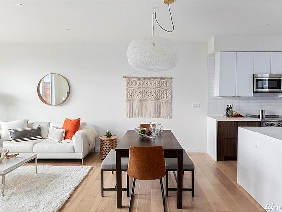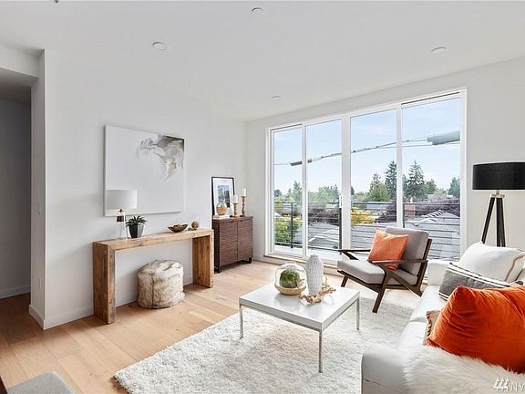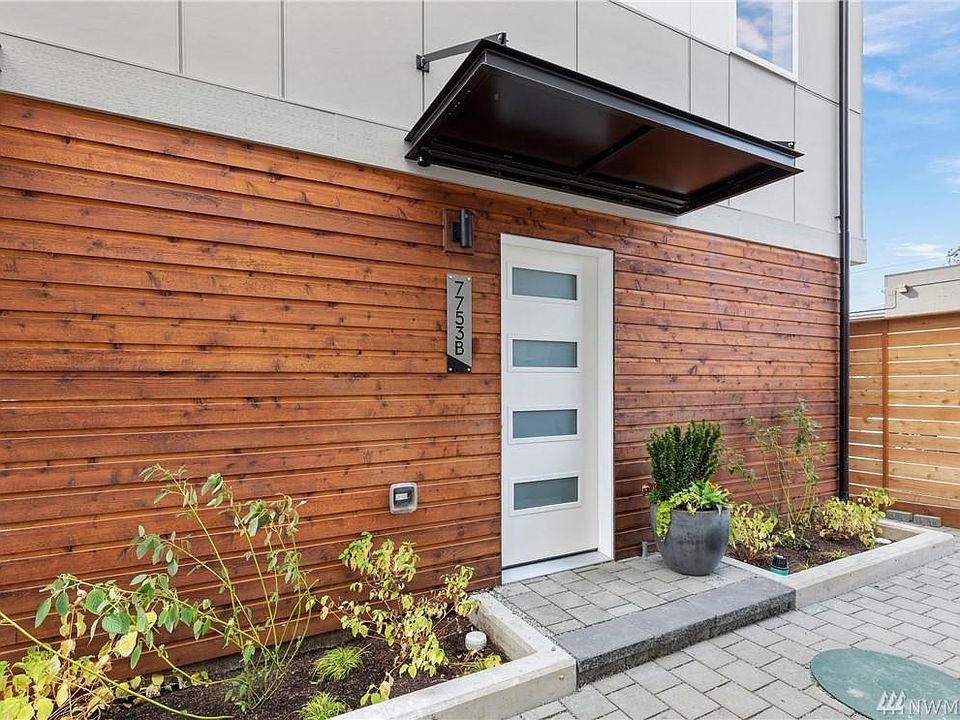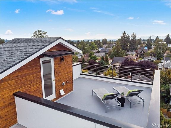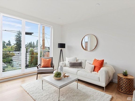 Modern Townhome built in 2020! Designer finishes, wide plank hardwoods thru-out, LED lighting, 2 decks & black iron railings. Modern kitchen offers high-end Beko appliances, Quartz waterfall counters & huge island. Master suite has walk-in w/ custom closet system, barn doors to 2nd bedroom & lower level ensuite bedroom. Rooftop deck has stunning Olympic Mountain views. Cedar siding, ductless mini-splits for Heat & A/C. Smart home enabled throughout the unit(light switches, curtains, AC, etc)! Covered parking w/ alley access is wired for EV car charger.