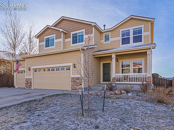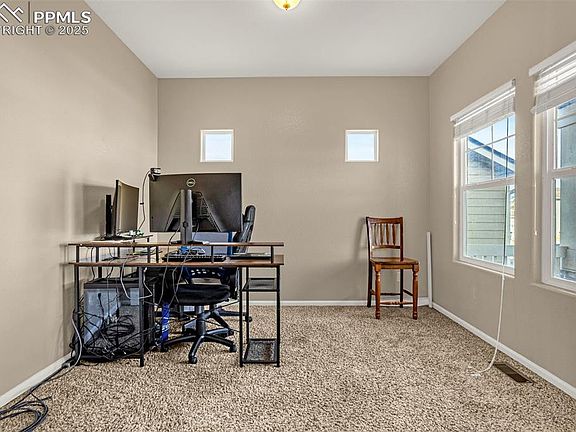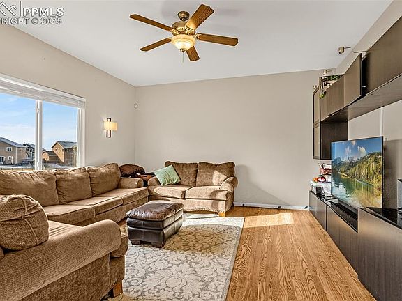 Ideally situated outside Ft. Carson Gate 20, this home is only a 10-minute drive to post. Also, minutes away from I-25 and Powers Blvd, offering easy access to shopping, dining, and more. Enjoy a short walk to open space, trails, and Crosscreek Regional Park, featuring a BMX track, fishing pond, soccer fields, pavilions, and a members-only community garden. Built in 2012, this spacious home offers 4 beds, 3 baths, an oversized 3-car garage, loft, private office, and unfinished walk-out basement ready for your designs. Add'l highlights include paid-off solar panels, a new composite deck (2024), and backs to open space. Welcoming you w/covered front porch overlooking the front lawn, complete w/sprinkler system. Inside, you'll find gleaming hardwood floors throughout most of the main level, high ceilings, neutral paint tones, and plenty of natural light. French doors open to a private office, which could serve as a bedroom or work area. Great Room features a ceiling fan, built-in entertainment center, and flows into the dining area w/walk-out access to the new composite deck, perfect for family gatherings and offering serene views of the open space behind the home. Open kitchen is designed for the home chef, w/SS appliances, 42" cabinets, smooth granite counters, ample storage, and a redesigned pantry w/pull-out shelving. Half bath w/built-in shelving, a basement access door, and the owner’s entry to 3-car garage complete the main level. Oversized garage boasts high ceilings, openers, and heavy-duty shelving, previously had Tesla charger. Walk-out basement is ready for your creative touches and opens to a backyard w/sprinkler system, featuring 5 grafted fruit trees that yield 4 types of fruit, plus room to grow. Upstairs, loft offers space for all ages. Steps away are 3 bedrooms, some w/mountain views, full bath w/dual sinks, and laundry room. The Primary Bedroom, offers some mountain views, walk-in closet w/closet system, dual sinks, oval tub, and stand-alone shower.