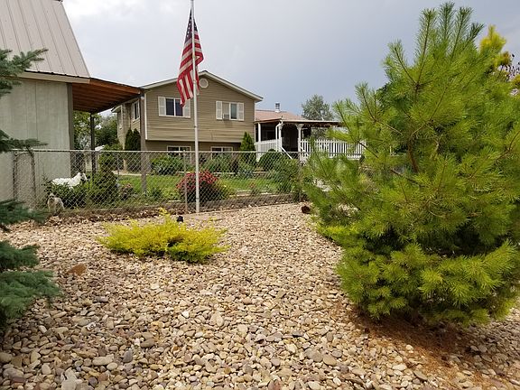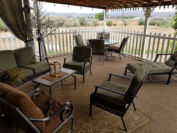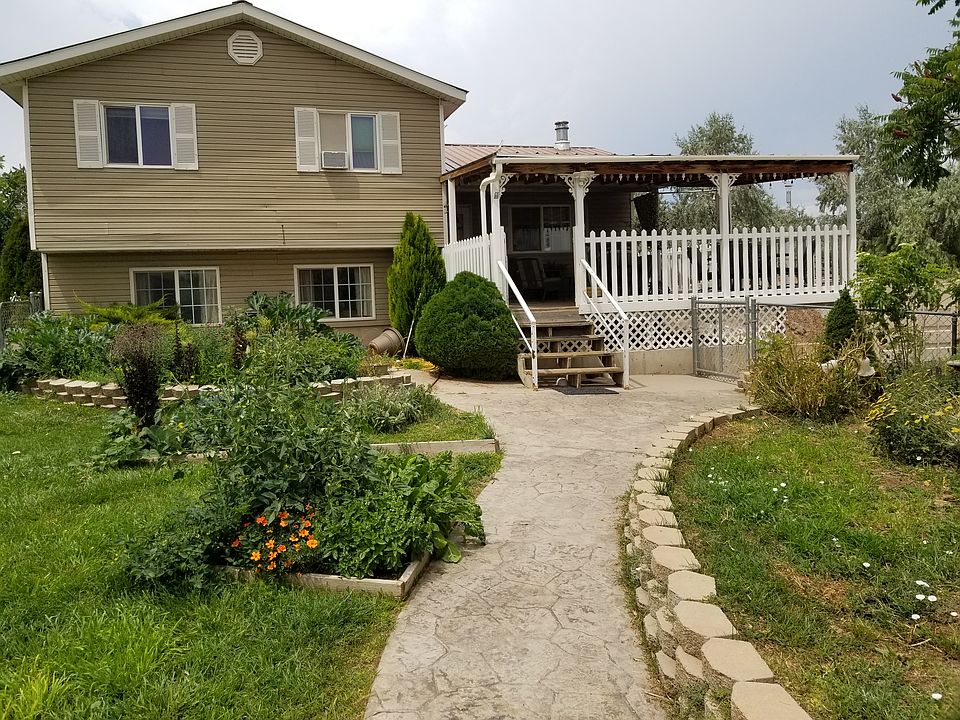 Large storage room; custom kitchen; large covered outside deck (24x18); 5,000 gallon water cistern; wood and propane heat; orchard with apples apricots, plums, grapes, raspberries, peaches pears and chock cherries; well insulated two story tiny house in front that can be used as an office or spare room; insulated storage or dog kennel (12x16); 2 story cabin (20x30) in back; 2 car garage with car ports on both sides; steel building (17x24) with concrete floor and fireplace; pole barn (30x36) with concrete floors; 6.67 water shares; buried storage (40 foot) container.
