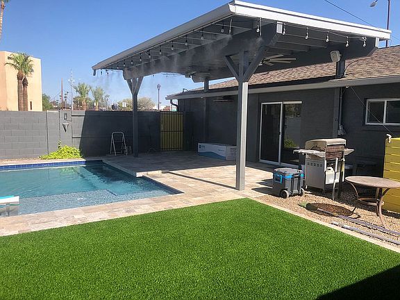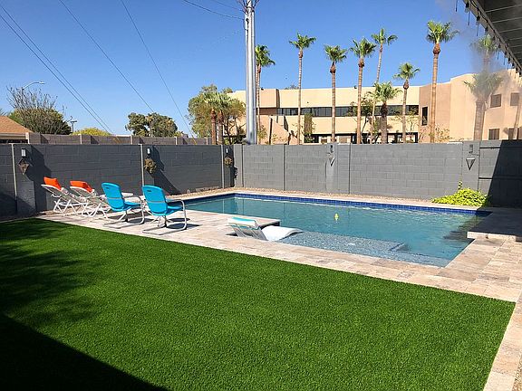 Beautifully updated open concept home located in the heart of Scottsdale without an HOA. Just minutes from Old Town, this 3 bedroom, 2 1/2 bath home has neutral paint throughout, ceramic wood like plank tile, and new carpet in the bedrooms. Brand new 14.78 KW solar system that produces enough power the electric company pays you so no more electric bills for 25 years. The kitchen includes all stainless-steel appliances, white quartz countertops, and grey shaker style cabinets with soft close doors and drawers. New washer and dryer in the laundry room. Backyard features low maintenance landscape turf with a travertine patio and covered sitting area, pool with swim up bar, water features and a splash pad/Baja ledge, outdoor travertine shower, commercial mister system, irrigated planters and a huge storage shed. Don't miss your chance to live in a stunning remodel walking distance from Old Town Scottsdale and El Dorado park! On the Green Belt.