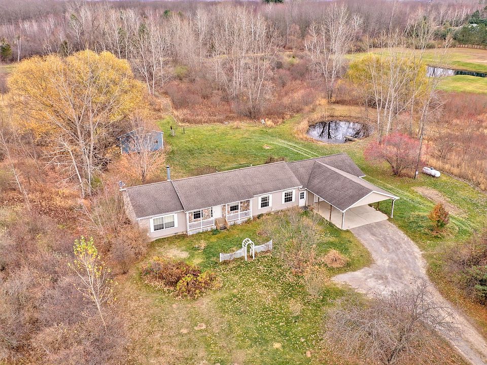 Breathtaking 3 bedroom, 2 bath country home on 10 gorgeous acres! King-size home featuring a beautiful, covered porch with “stone” facia, open floor plan, living room with cozy fireplace, stunning kitchen with microwave, stove, dishwasher, center island and storage galore, master bedroom boasts of a double sink and a jetted tub, plus handy main floor laundry! . Back slider opens to a huge backyard with pond, 24x32x10 pole barn, and acres of woods to hunt in! Nice 2.5 car attached garage plus carport! Located close to town this home offers that rural feel with access to shopping and gas just a mile away! Easy access to M-15 for that work commute also. Come take a look! This one is perfect for you!