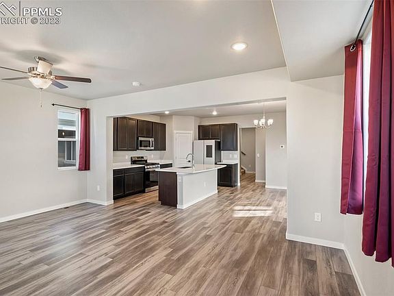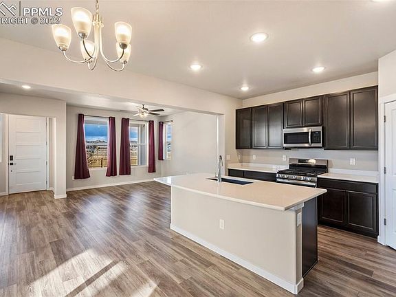 Welcome to this beautiful move-in ready 3 bed, 3 bath home with a 2 car attached garage. As you approach, you'll be greeted by a charming front covered patio, perfect for enjoying the outdoors. Step inside and you'll immediately notice the luxury vinyl flooring that flows throughout the main floor. The mud room, conveniently located just off the garage, offers a practical space to store shoes and coats and features a drop zone for charging cell phones and storing keys. The open main floor boasts recessed lighting, creating a warm and inviting atmosphere. The kitchen is a true highlight, featuring elegant quartz counters, stainless steel appliances, a smart fridge, and a gas range/oven. Adjacent to the kitchen is an inviting eating area that opens up to an enclosed side yard, providing a private outdoor space for relaxation and entertainment. The unfinished basement is a blank canvas, insulated and pre-plumbed, ready for your personal touch. With 9-foot ceilings, a sump pump, and large egress windows the potential for additional living space is limitless. Upstairs, you'll find the convenience of a laundry area and four bedrooms. One of these bedrooms would serve perfectly as a home office, offering a dedicated workspace. The master bedroom is a retreat of its own, complete with a walk-in closet and an attached bathroom featuring a luxurious walk-in shower. Additionally, the master bedroom opens up to a covered balcony, providing a tranquil spot to enjoy your morning coffee or unwind after a long day. Located near hospitals, dining options, and 23 minutes to Peterson Space Force Base. Don't miss the opportunity to make this stunning home yours. With its modern features, thoughtful design, and endless possibilities, it's the perfect place to create lasting memories. Contact us today for a showing and come envision your future in this remarkable property.