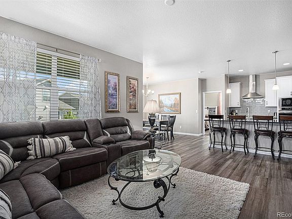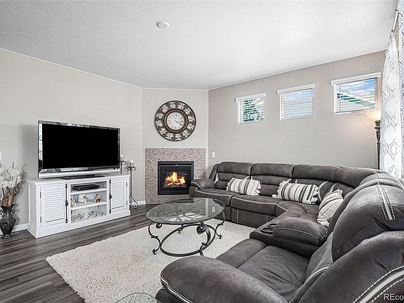 Step inside and be greeted by an open floor plan bathed in natural light. The spacious living room, with its cozy fireplace, is perfect for family gatherings or quiet evenings at home. The upgraded luxury vinyl flooring in the main areas adds a touch of elegance and durability, ideal for both everyday living and entertaining. The heart of the home is undoubtedly the stunning kitchen. Featuring quartz countertops, a spacious island, and top-of-the-line stainless steel appliances—including a gas cooktop with a sleek range hood—this kitchen is a chef’s dream. The ample cabinetry and walk-in pantry provide plenty of storage, ensuring that everything you need is within easy reach. Adjacent to the kitchen, the dining area is perfect for hosting dinner parties or enjoying meals with loved ones. Step outside to the large, covered patio where you can enjoy Colorado’s beautiful weather year-round. The backyard is a gardener’s delight, with well-maintained landscaping and space for your own personal touch. This home boasts three generously sized bedrooms, including a primary suite that serves as your personal sanctuary. The primary bedroom features a luxurious en-suite bathroom with quartz countertops, a walk-in shower, and a spacious walk-in closet. The additional bedrooms offer flexibility, whether you need extra space for guests, a home office, or a hobby room. Practical features such as a three-car attached garage, central air conditioning, and a separate laundry room make this home as functional as it is beautiful. With easy access to I-25, this location offers the perfect balance of tranquility and convenience, with shopping, dining, and entertainment just minutes away. Virtual tour available.