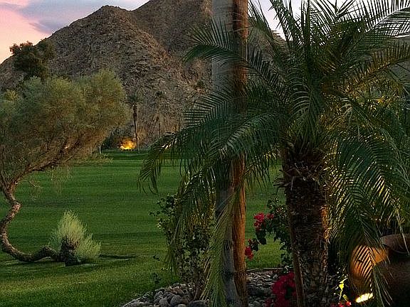 Unique location - extra large lot (.44 acres) with amazing unobstructed views and adjacent to Indian Wells CC golf course with pond and fountain, and spectacular highlighted mountains at night. Villagio subdivision. Indian Wells Country Club security gate. Only one neighbor!! Private!