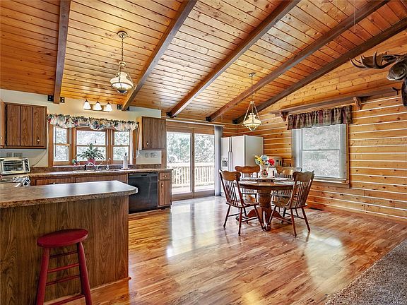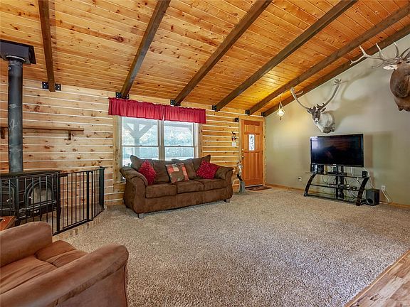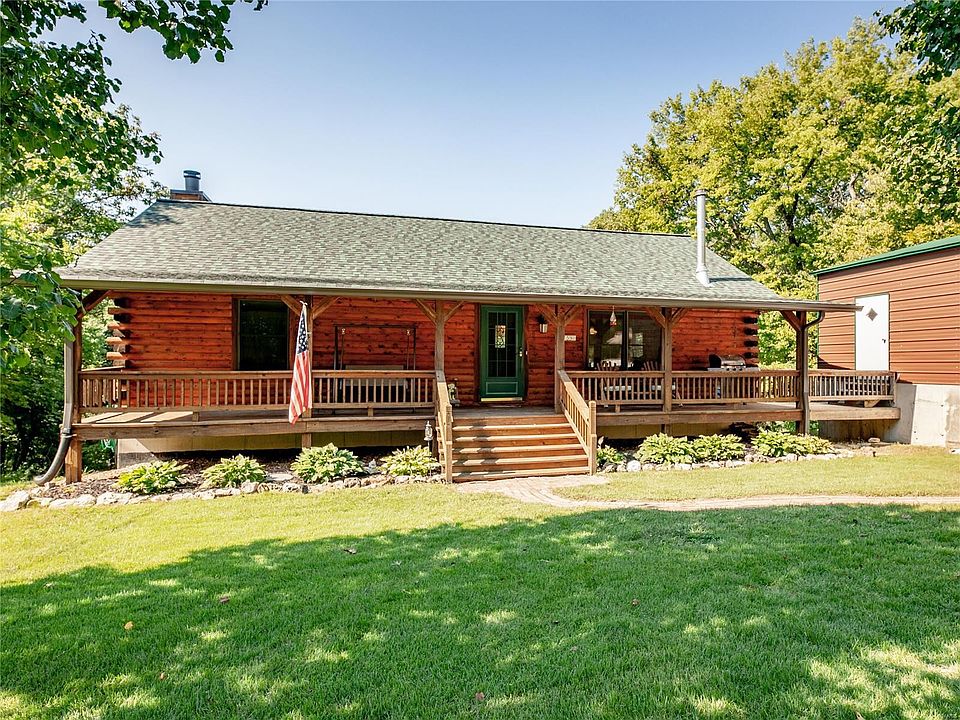 Wonderful ranch style log home on just under 2 acres in Fox schools. Enter from the huge covered front porch that spans the length of the home into the open floor plan living, kitchen & eating area w/vaulted ceiling. Newer flooring & wood burning stove in living room. Nice deck off the eat-in kitchen area. Great sized kitchen & round the main level off w/2 nice size bedrooms, full bath w/optional MFL w/hook-ups in hall storage area. Finished LL walk-out includes additional bedroom, bonus room w/woodburning fireplace, laundry room, workshop & full bath. Outside you will find matching storage shed w/covered entry & another small storage for lawn equipment. The home also offers a huge 40x26 detached garage, large enough for your cars, boats or trailers & work area. Some updates or improvements since 2014 include staining & sealing of entire home, new roof, guttering, soffit & garage. Dont miss this opportunity. Come see it before its gone.