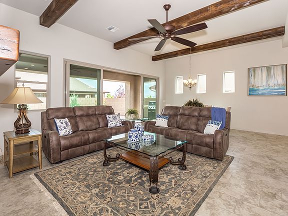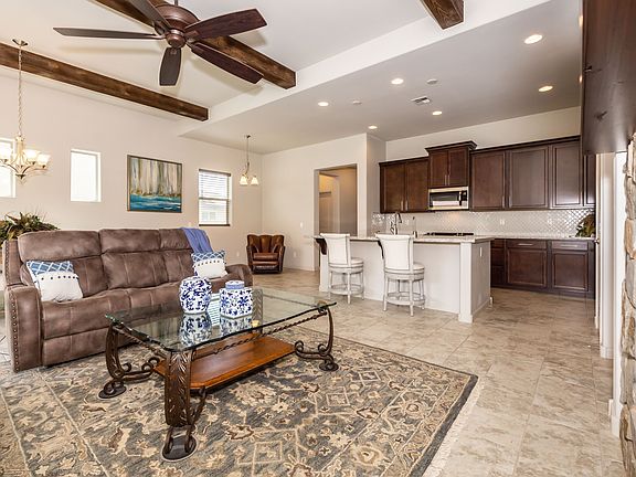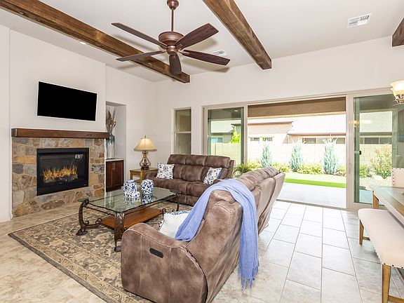 Stunning Carefree Plan'' 1749 Sq. Ft. 2 Bed, 2.5 Bath, Gourmet Kitchen features a large center Della Terra Monet Quartz Island, 42'' Shaker Cabinetry w/Soft Close, Whirlpool appliances, Reverse Osmosis under sink, Gas 5 burner Range, Greatroom w/Beamed ceiling, 72'' Kichler Fan, Gas Fireplace w/Shady Grove Stone, 55'' Television mounted above mantel, 12X24'' designer floor tile and upgraded carpeting, 16' glass sliding doors to Pro-Landscaped private back yard, Gas Stub for BBQ. Owner suite w/quartz Executive Height Cabinetry Double rectangular under mount sinks, rimless glass shower enclosure, Designer Tile surround w/Bench, large walk-in closet, Exec Height, tank-less water heater, LED lighting, water softener. Paver driveway. Move in Ready!