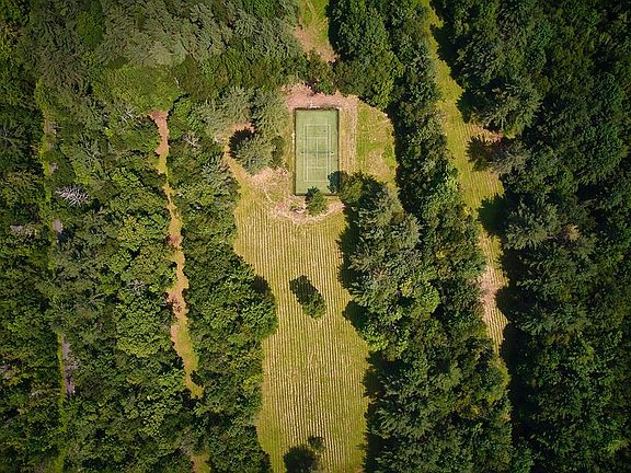 - Exterior features: Porch, Porch - Screened, Deck, Tennis Court(s), Barn/Stable