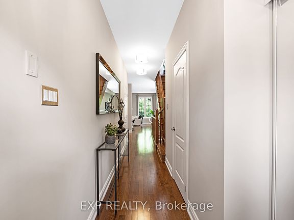 Discover a rare blend of size, privacy, and elegance in this impeccably maintained executive end-unit townhome by Daniels.Tucked within a quiet enclave of the prestigious Stonehaven neighbourhood, this residence offers a serene retreat backing onto protected forest. Nearly 2,000 sq. ft. of finished living space across three levels features smooth 9-ft ceilings and rich hardwood floors throughout, creating a warm, open feel.The gourmet kitchen shines with stainless steel appliances, granite counters, and a large centre island with breakfast bar-ideal for entertaining. Step from the living area onto your private covered balcony to enjoy stunning four-season forest views.Upstairs, the luxurious primary suite features a custom walk-in closet and 4-piece ensuite with marble counter and deep soaker tub. The professionally finished walk-out basement extends your living space with a family/fitness area, full bath, and renovated laundry room with built-ins. Sliding doors open to a private patio and landscaped yard, blending indoor and outdoor living.Upgrades include: custom closets, quartz vanities, new antimicrobial cork-underlay flooring (2024), freshly painted interiors (June 2025), gas BBQ hookup, upgraded lighting, decor vents, interlock brick walkway and patio, and a unique rock garden exclusive to this unit.Enjoy low-maintenance living with modest condo fees, direct garage access, and proximity to St. Andrews Valley Golf Club. This exceptional home combines modern comfort with natural tranquility-an absolute must-see.