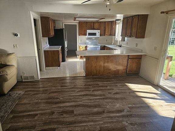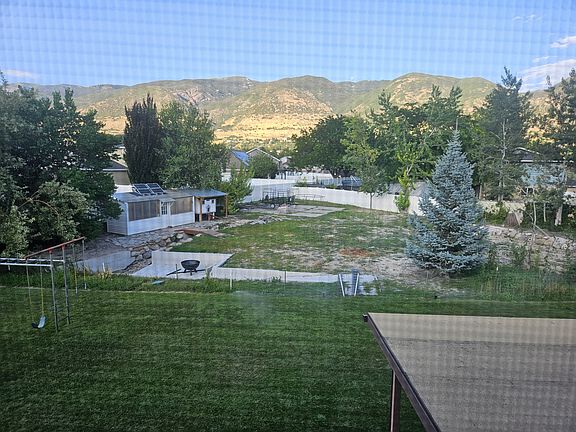 Home with two living areas around the kitchen and a very large yard. 3 of the 4 bedrooms are large and one is smaller. There is another room that has functioned as a storage area, man/woman-cave, or bedroom. The primary bedroom is large with walk-in closet and unsuited bathroom. All bedrooms have ceiling fans. The home has newer furnace, central AC, and water heater, automatic sprinklers, a very large covered deck. It sits on nearly 1/2 acre and has a chicken coop and greenhouse for those so inclined (would just have to maintain the chicken fence to keep them out of the yard and garden areas. The backyard has mature apple, apricot, and cherry trees. It has a water feature and an additional area to hang out and have a fire. No ESA due to allergies.